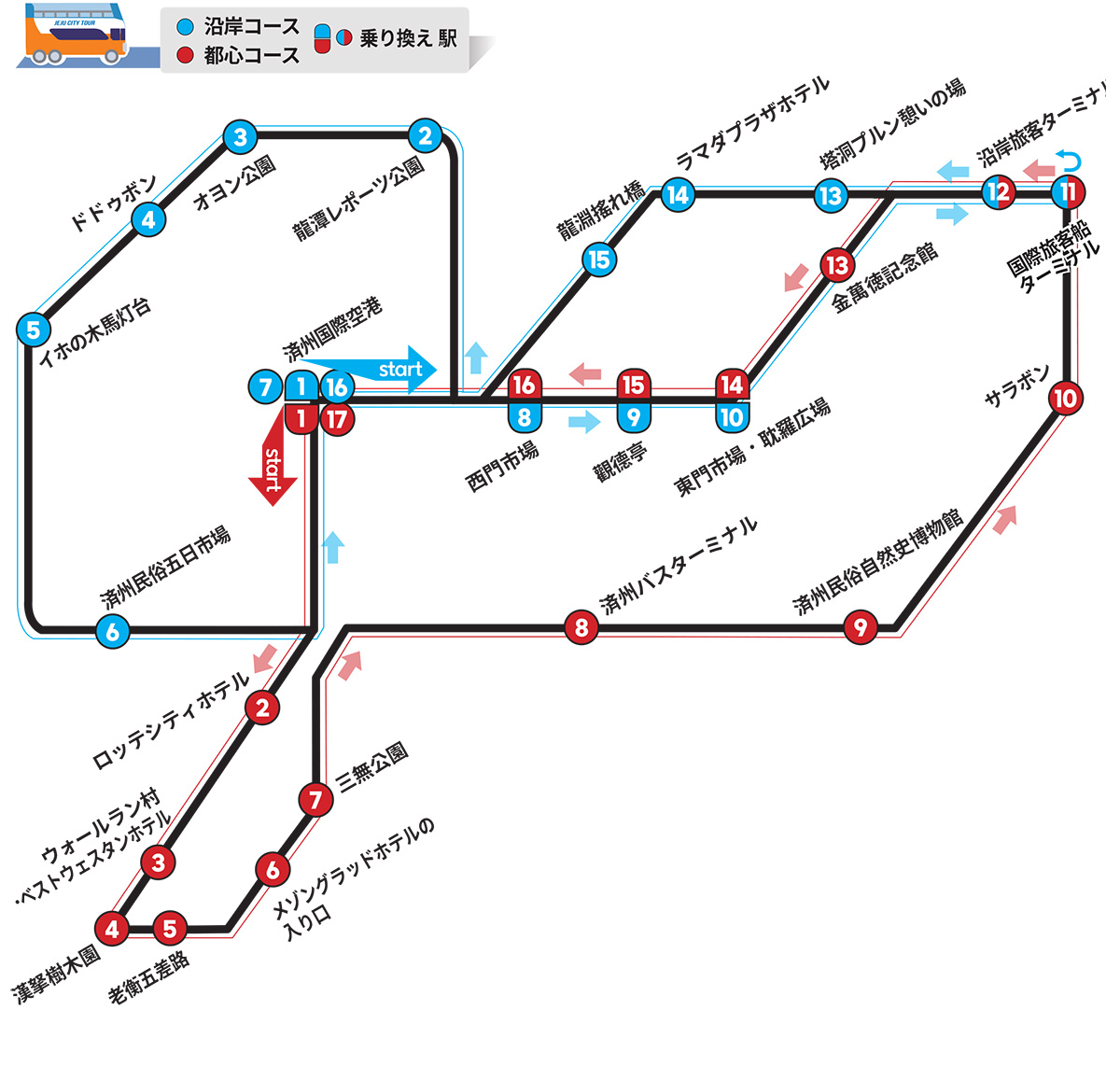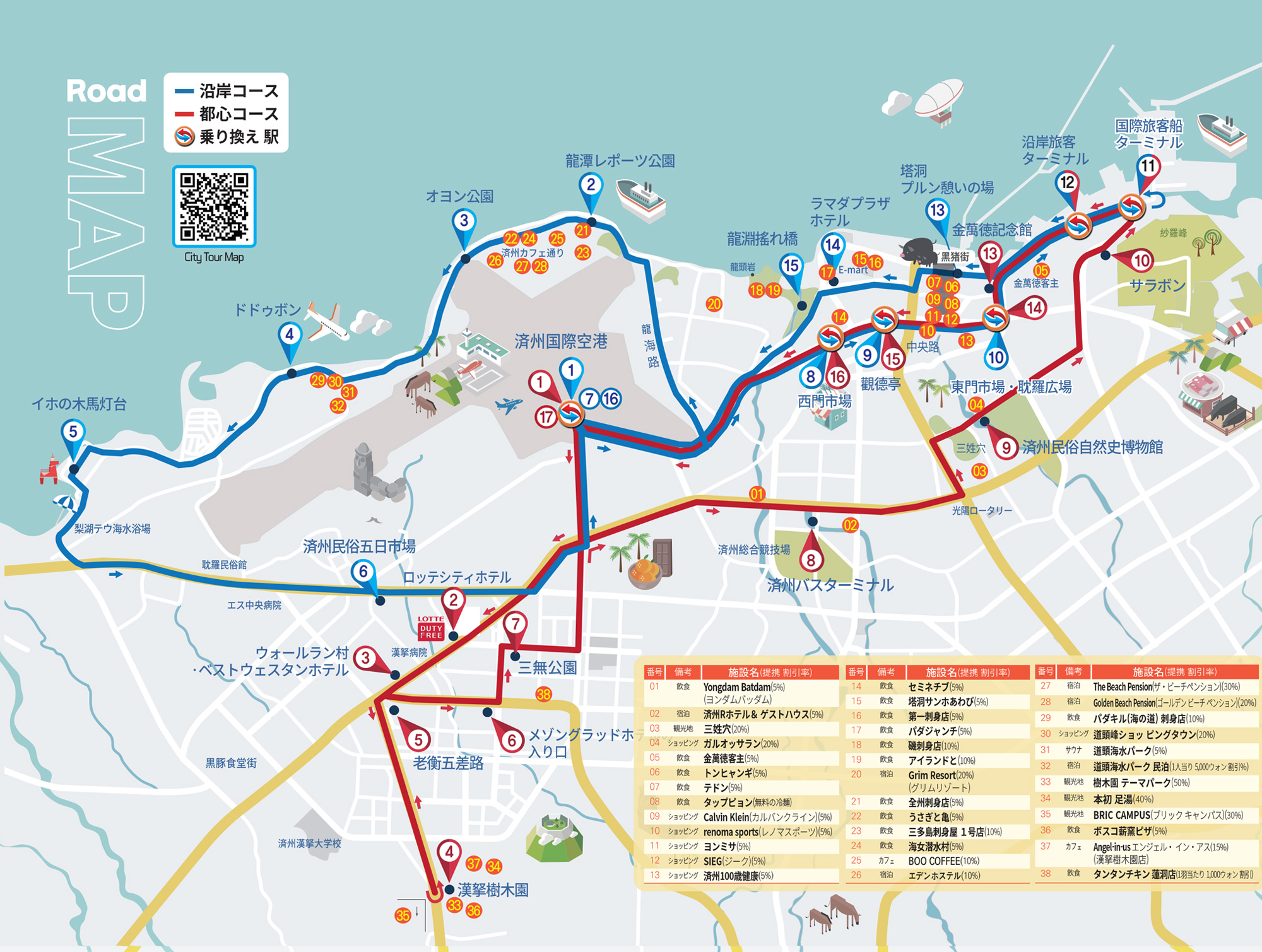 オルレギル17コースが経由し、済州空港 はもちろん、済州市内に最も近い梨湖テ ウ海水浴場があります。海水浴場は砂浜 の傾斜が緩やかで波が強くないため、子 供たちが遊びやすい場所です。夜になる と「双子の木馬灯台」が点灯し、昼より も美しい夜を彩ります。